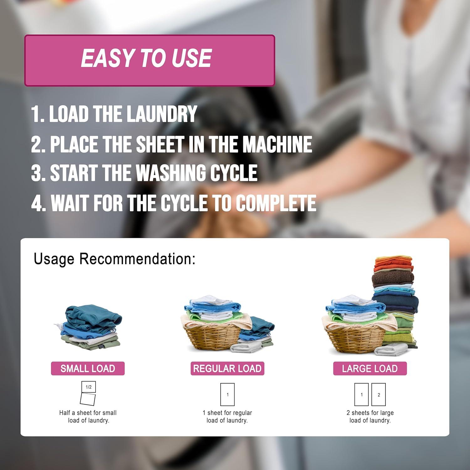 How to Use: Use half a sheet for small loads, one sheet for medium loads, and two sheets for large loads. Place the sheets directly into the washing machine drum before starting the wash cycle. Sheets dissolve quickly in water, effectively removing dirt and stains, leaving your laundry fresh and clean.