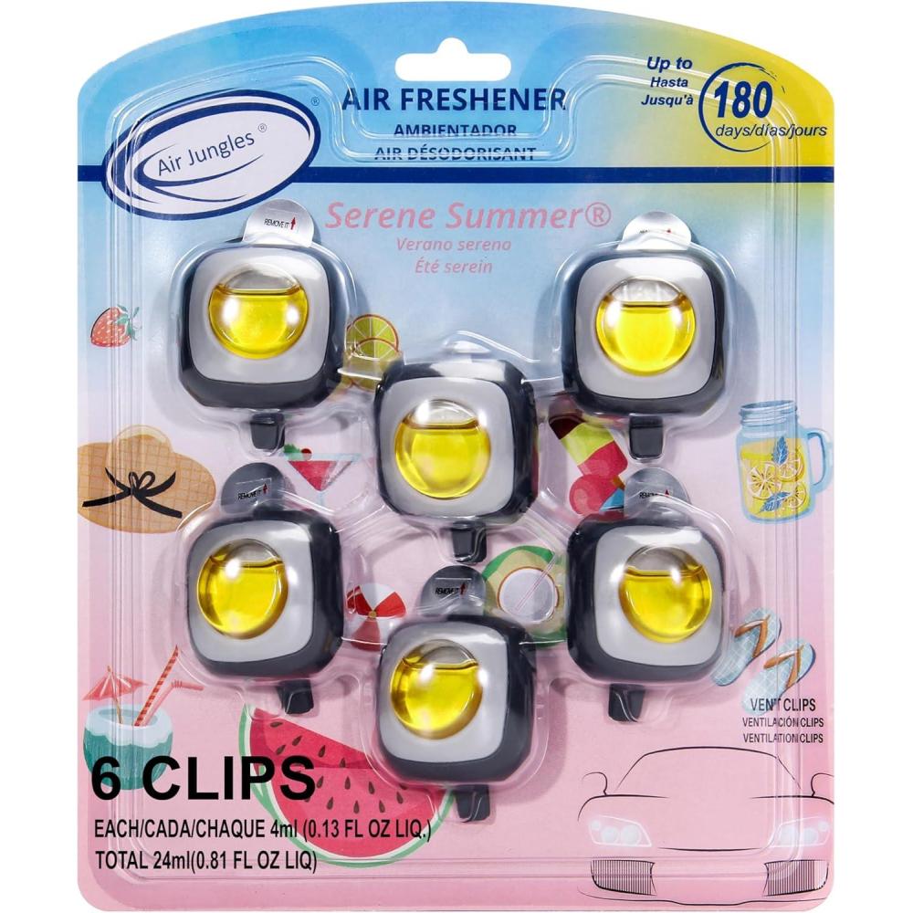 Air Jungles Serene Summer Scent Car Air Freshener Clip, 6 Vent Clips, 4ml Each, Long Lasting Air Freshener, Up to 180 Days Car Refresher Odor Eliminator(Serene Summer)